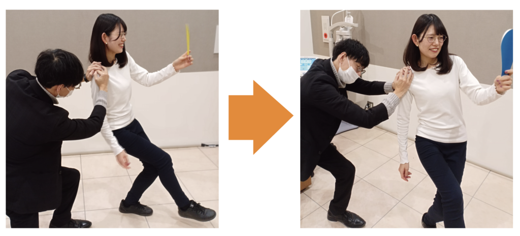 不得意なカラーを見ている時は、体幹が崩れやすくなりますが → 得意なカラーを見ている時は、同様に肩を押しても崩れません。